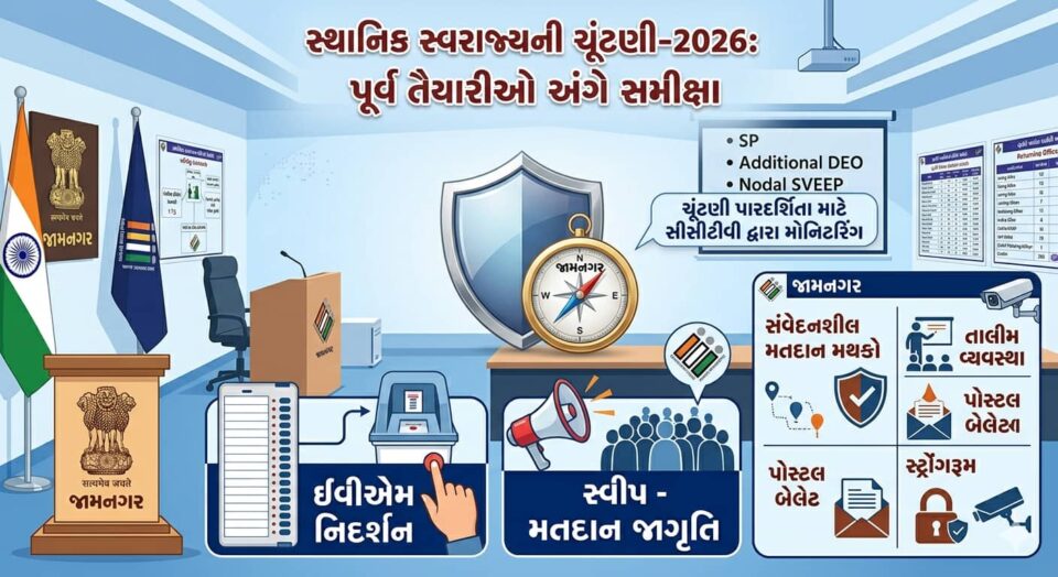 આમ, જામનગર જિલ્લા વહીવટી તંત્ર ૨૦૨૬ની સ્થાનિક સ્વરાજ્યની ચૂંટણી માટે સંપૂર્ણ રીતે સજ્જ છે. વધુ અપડેટ્સ માટે જોતા રહો અમારા સમાચાર.