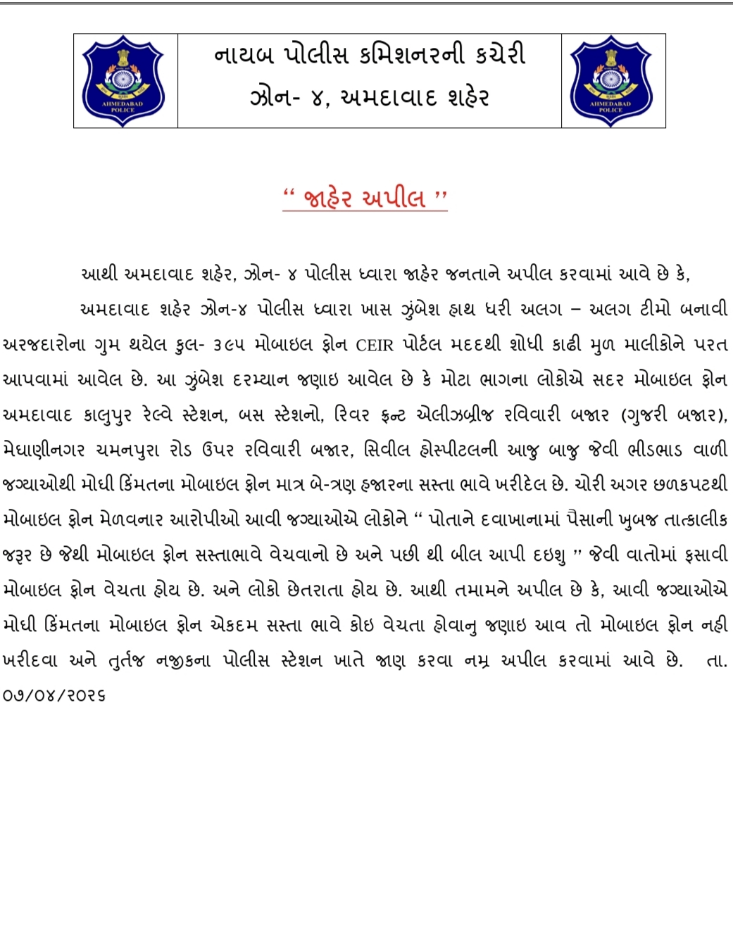 અમદાવાદ ઝોન-૪ પોલીસ દ્વારા તાજેતરમાં એક ખાસ ઝુંબેશ હાથ ધરવામાં આવી હતી. આ ઝુંબેશ અંતર્ગત પોલીસની અલગ-અલગ ટીમોએ CEIR પોર્ટલની મદદથી કુલ ૩૯૫ જેટલા ગુમ થયેલા મોબાઈલ ફોન શોધી કાઢ્યા છે અને તેના અસલી માલિકોને પરત સોંપ્યા છે.