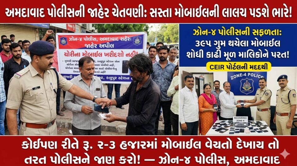 અમદાવાદમાં જો તમે પણ રસ્તા પરથી કે ભીડભાડ વાળી જગ્યાએથી સસ્તા ભાવે મોબાઈલ ફોન ખરીદવાના શોખીન હોવ, તો આ સમાચાર તમારા માટે ચેતવણી સમાન છે. અમદાવાદ શહેર ઝોન-૪ પોલીસ દ્વારા જનતા માટે એક